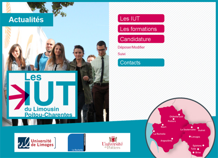 Dans la partie gauche de l'image, un groupe de jeunes, garçons et filles, regarde en avant, le corps en partie caché par une pancarte portant l'inscription IUT. A droite, en haut, est présenté le sommaire du site, en bas, dans un cercle est inscrite une carte de la Région, en rouge sur fond rose.