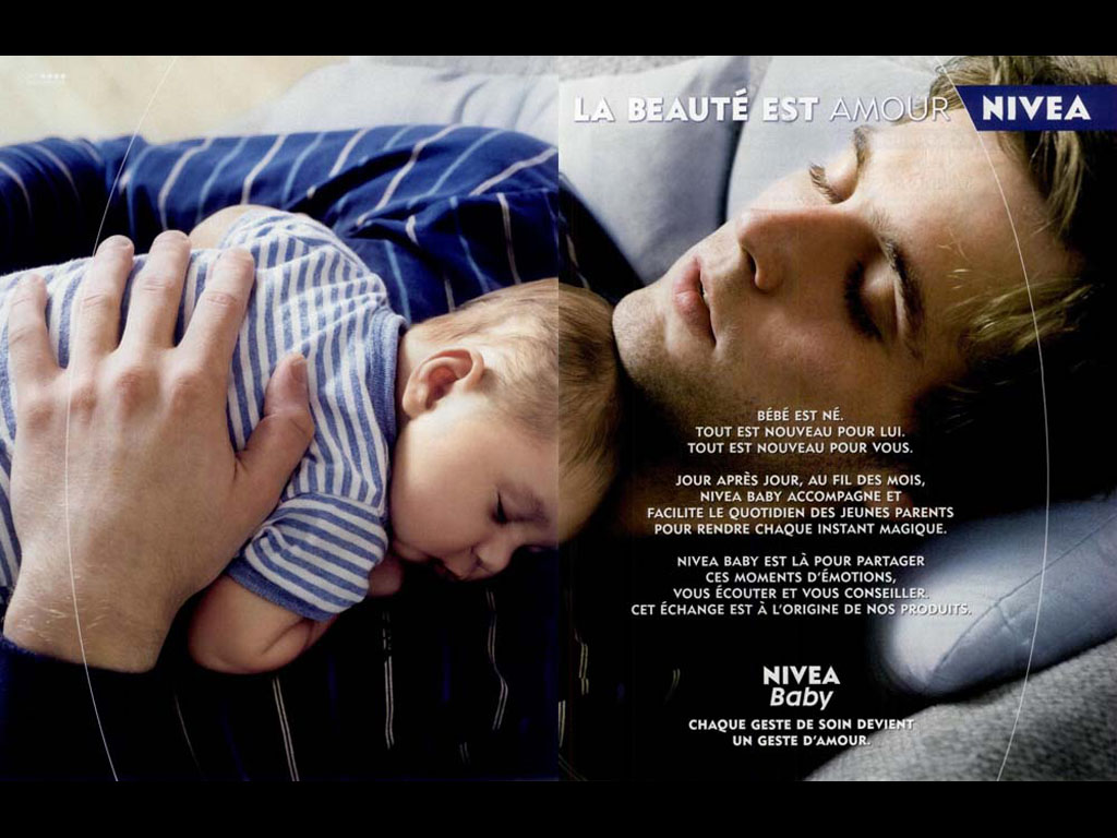 Un homme est allongé sur un lit, les yeux fermés, maintenant avec sa main gauche un bébé endormi à plat ventre sur son buste. Tous deux portent des marinières rayées bleu et blanc. En haut de l'image on peut lire le slogan "Le beauté est amour - Nivea". En dessous un long texte publicitaire, une dizaine de lignes, qui se termine par "Nivea Baby. Chaque geste de soin devient un geste d'amour".